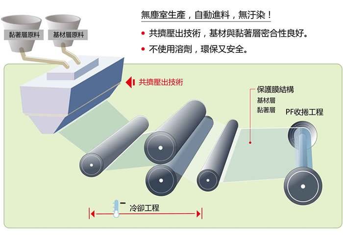 因為是同時將兩種以上塑膠材料經高溫加熱擠壓出,不僅壓出冷卻的成品兼具不同塑料功能;基材層與粘著層完全熔合所押出的膠膜本身,一層即具有黏性,長期貼合也不會殘膠-這正是與傳統塗布式保護膜最大不同之處。