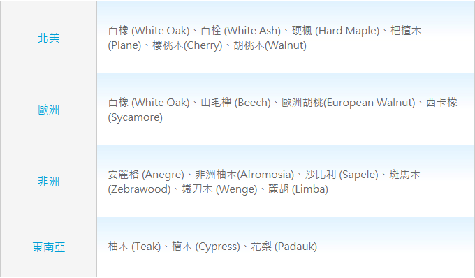 泱進從事原木進出口貿易,來源樹種遍及全球,如下所示: